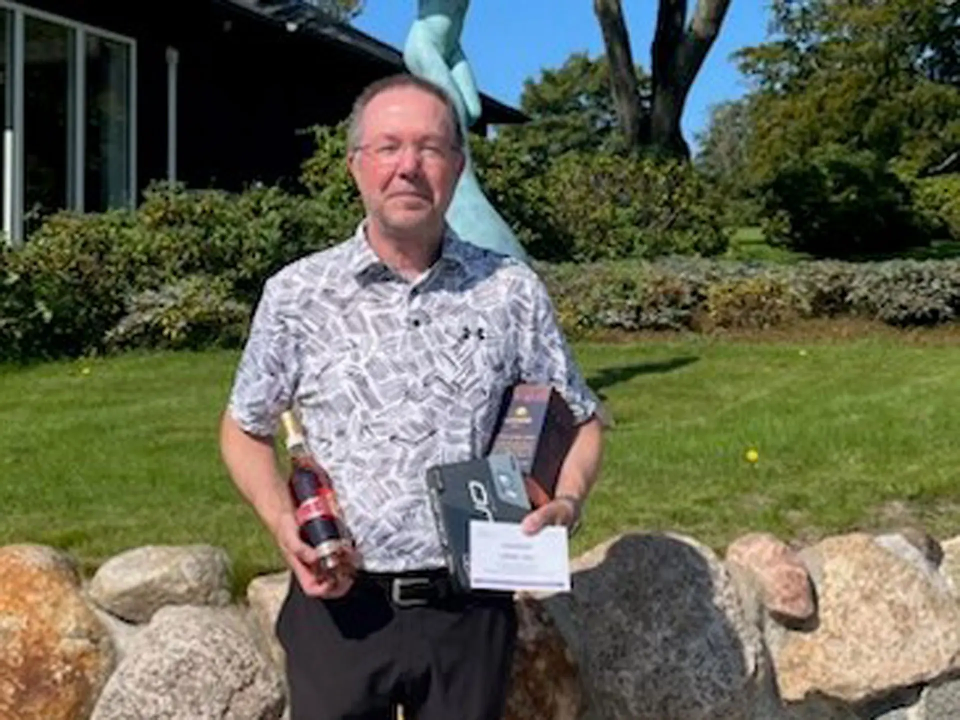 Frank modtog en flaske rom fra Liljecaféen tillige med et gavekort på kr. 250,-, 1 dusin bolde fra Golf Shop Korsør og en flaske ”Plantation Rum Gran Anejo” fra Søberg Vin i Korsør.