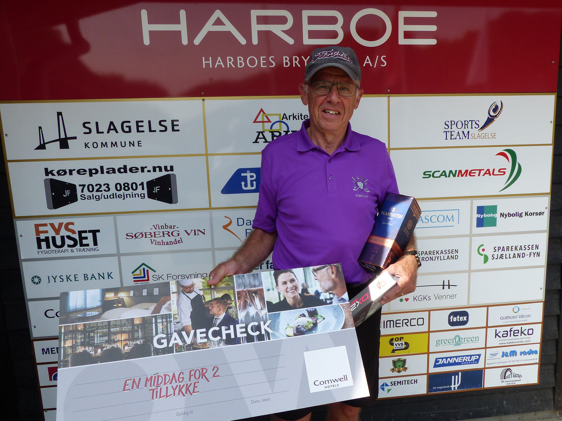 Preben modtog et gavekort til en middag for 2 personer på Comwell Korsør, 1 dusin bolde fra Golf Shop Korsør og en flaske ”Plantation Rum Gran Anejo” fra Søberg Vin i Korsør.